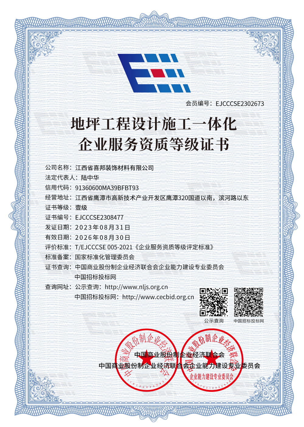 江西省喜邦装饰材料有限公司是一家拥有至少16年至20年地坪行业从业经验的专业优秀团队组成,从事各种地坪材料研发、生产、销售和施工为一体的高新技术企业,公司是《AAAAA级全国性行业协会中国建筑业协会会员单位》《中国建筑材料联合会会员单位》《中国电子仪器行业协会防静电装备分会会员单位中国建筑材料联合会地坪产业分会会员单位中国腐蚀控制技术协会会员单位中国建材工业经济研究会产品质量专委会会员单位中国商业股份制企业经济联合会会员单位地坪工程设计施工一体化企业服务壹级资质防水防腐保温工程专业承包贰级资质》是绿色建材评价 高固体分防腐蚀涂料》《给水排水工程水池结构防腐防水技术规程》国家团体标准参编单位拥有安特佳®,速丽固®,艺术美®,康美健®,特尔固®,喜邦装饰®等品牌,对环氧地坪(环氧树脂)、金刚砂耐磨地坪、混凝土密封固化剂,渗透剂地坪、防静电地坪、防腐蚀地坪(防腐防静电地坪)、2米3毫超平地坪,自流平地坪、运动场地坪、硅PU球场、地下车库地坪、停车场地面、无振动止滑坡道、一体无机磨石地坪、环氧磨石地坪、聚氨酯地坪(聚氨酯砂浆地坪,聚氨酯超耐磨地坪)、PVC地板、不发火防爆地坪(NFJ不发火防静电地坪)、夜光漫道、防滑陶瓷颗粒、环氧微珠超耐磨、EPDM塑胶跑道、艺术压花地坪、透水混凝土地坪(透水路面)、泼墨地坪、旧地面维修翻新等各类工业地坪的施工具有丰富的实践经验,同时承建江西地区的西卡Sikafloor,巴斯夫,迈伯仕等品牌施工服务。公司奉行ISO9001:2000国际质量管理体系,公司荣获《建材质量-先进技术推荐企业》环氧乙烯基重防腐涂料荣获《节能建材工程建设推荐产品》公司创始人荣获城市更新优秀模范》称号,是中国航天科技优质供应商》并在四川泸州、重庆、湖南、湖北、福建、新疆、内蒙古,浙江等地设有办事处。